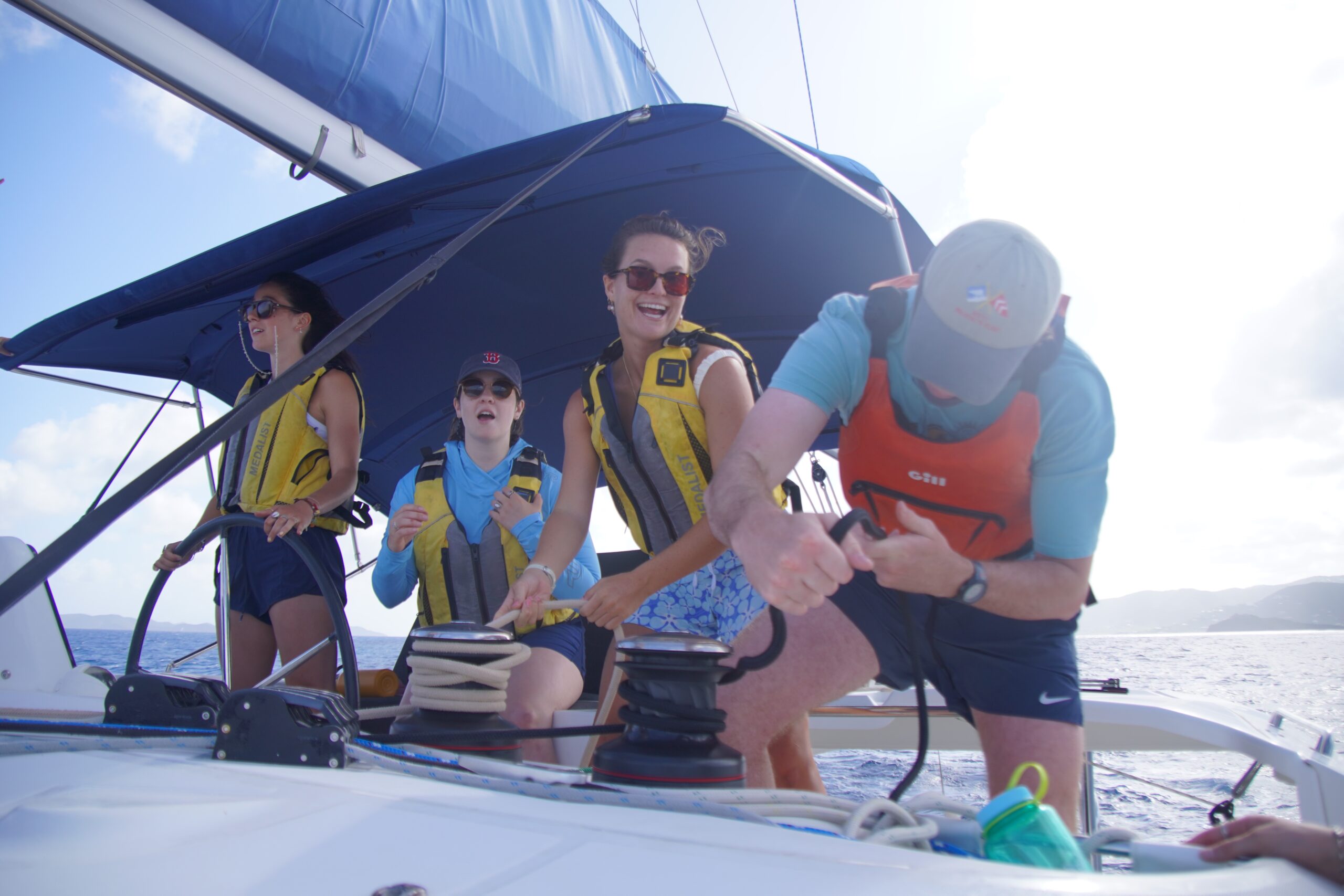 After a thorough de-docking lesson, we set sail for Marina Cay. Once we got there, we had a refreshing swim, our first boat clean, and an iconic ocean shower. We capped off the day with a delicious carbonara pasta dinner. Evening meetings wrapped things up before we all settled in, gently rocked to sleep by the waves.