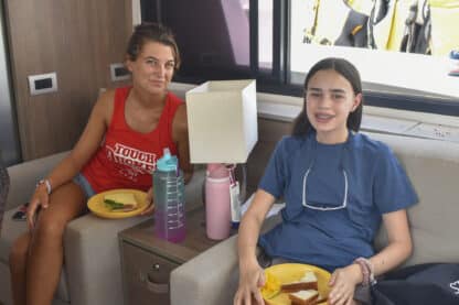 On Monday evening, students ate a hearty dinner of cheesy potatoes, veggies, chicken, rice, and pizza. They put their bags in their cabins and set up for the first night of boat life.