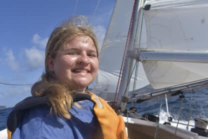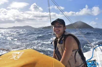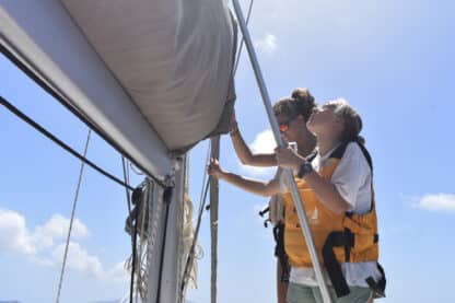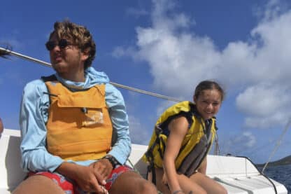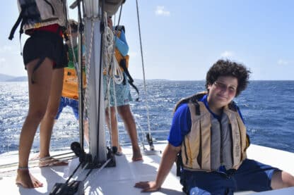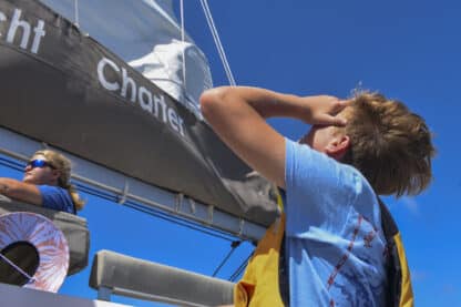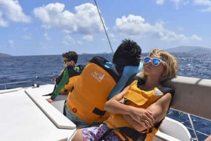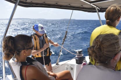 Today, we woke up at the beautiful Lee Bay and started preparing breakfast, which included bacon and eggs. Shortly after, we upanchored and traversed out of the bay, with the skipper of the day, Ellie, and first mate/navigator Maria working together to keep our heading. Despite the very windy conditions of 25 knots, we successfully raised the main sail with two reefs, followed by the jib.