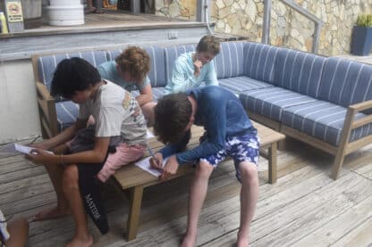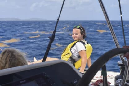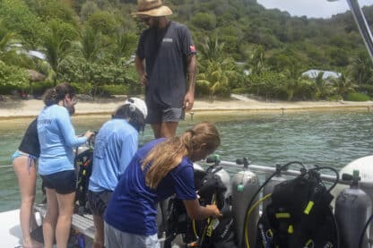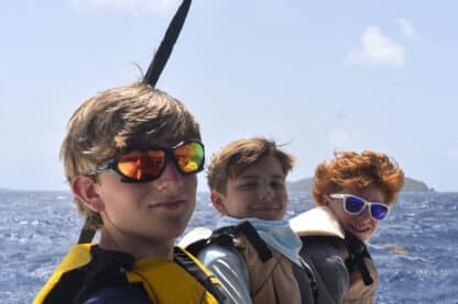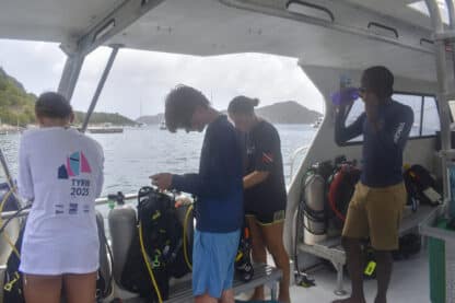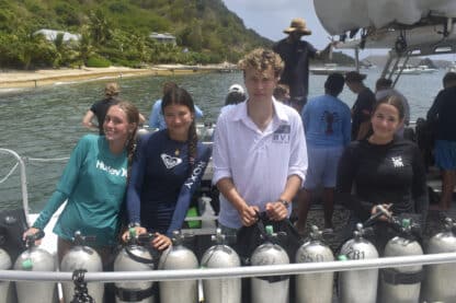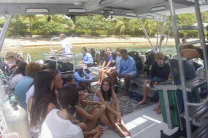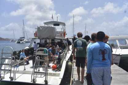 After doing a jellyfish check, the crew of Moet enjoyed a well-deserved swim and a watermelon that may or may not have fallen and cracked onto our kitchen floor while underway. To break the 4th wall briefly, it’s not even lunchtime yet folks. For lunch, we ate delicious pizza bagels, prepared by Presley and Sophie. Following a quick lunch clean, divers were shuttled ashore for their diving orientation from the lovely Sail Caribbean dive staff.