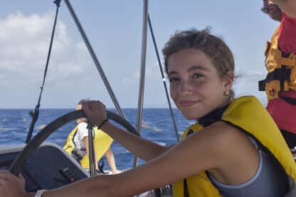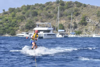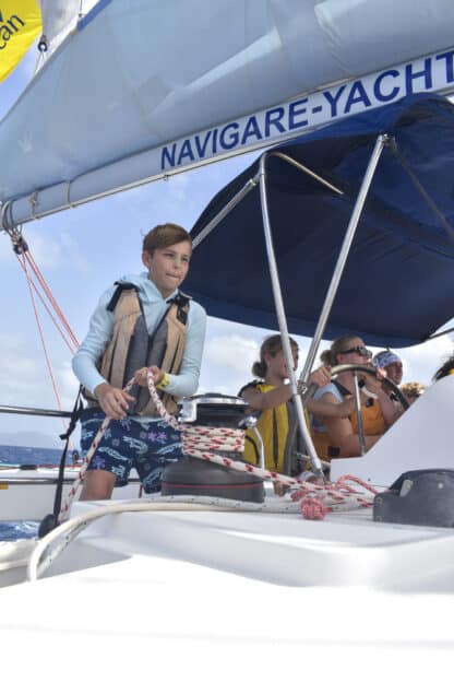 After cleaning breakfast and doing PDC’s (pre-departure checks), we dropped the ball and motored away from Trellis Bay. As the cove of Trellis Bay receded, the heavier wind and taller waves made for a great second day of sailing. Despite these more difficult conditions, they proved no match for the Moet crew, with Corte as our skipper of the day, Cece as mate, and Lachlan as navigator.