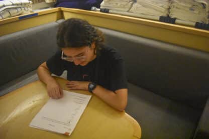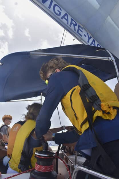 Once the crew deemed our location safe from oncoming vessels and nearby land, we raised our sails with not one reef… but two! (It was gusting over 24 knots!) Even with these two reefs, we still broke 9 knots of boat speed as we sailed downwind to Cooper Island. For each gybe, a tack was done instead for safety and practice, with everyone having the chance to try the working and lazy jib sheet.