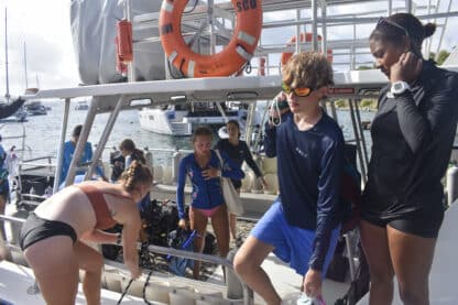 Once we finished our hike, we gathered again to then head back to Cooper where we joined our fellow mates. We had chicken caesar salad for lunch and then started getting ready for shore time and more afternoon dives. While the divers continued diving and ASA students got the chance to colgate, all the other students had an informative marine biology lesson by Finn about sea grass.