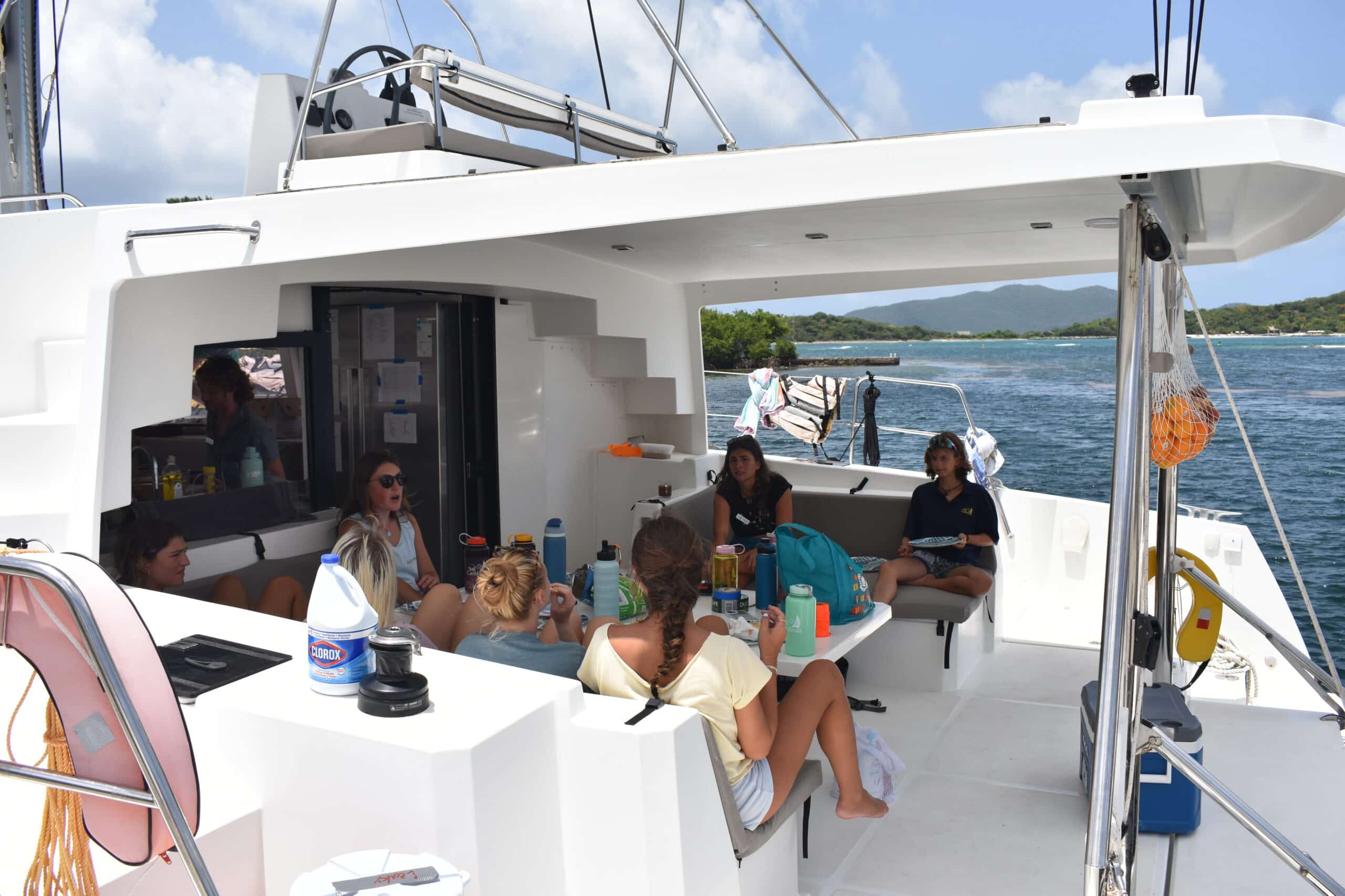 After a lunch of burgers and hot dogs, we began our sail to Marina Cay. We learned how to raise the sails, moor the boat, and work as a part of an effective team aboard!