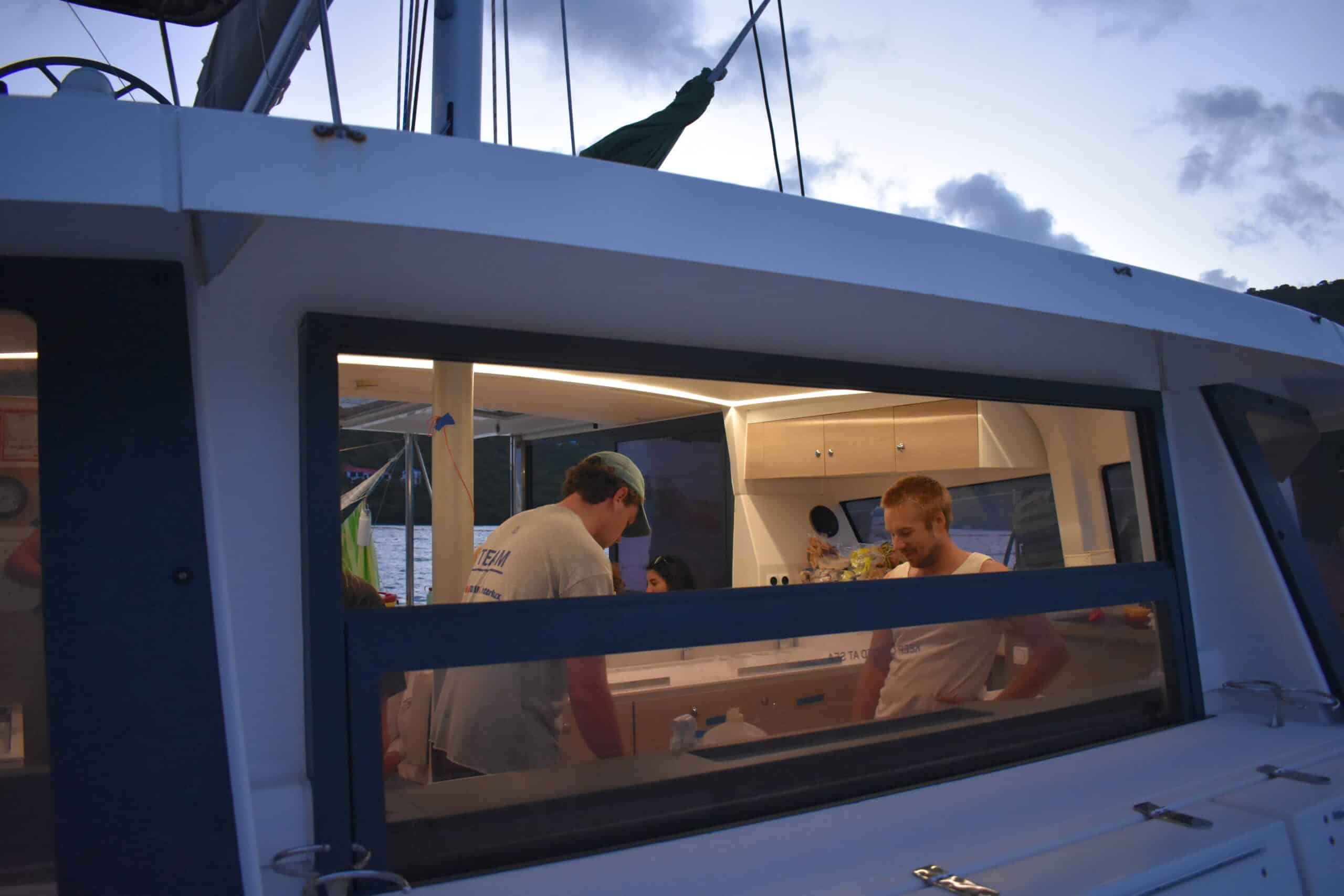 At the mooring ball, we took a quick swim, followed by an ocean shower. We then finished the evening with quesadillas for dinner and our first boat meeting at sea.