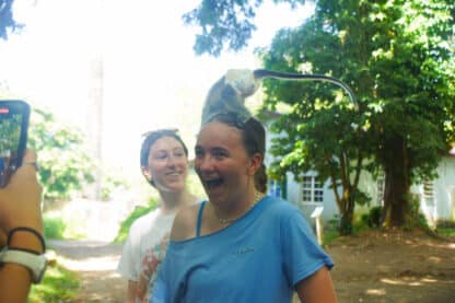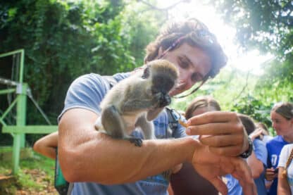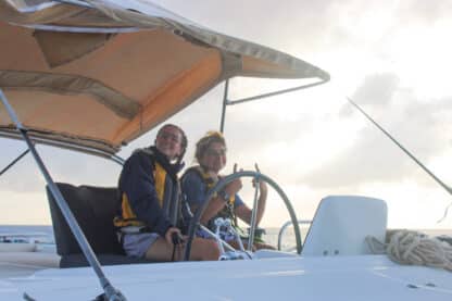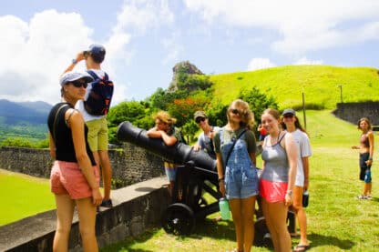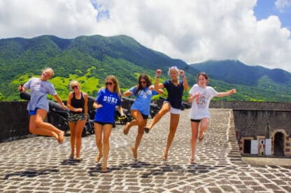 Hi Delta families! I had the absolute pleasure of joining the Delta Fleet on their adventures down island for a few days, and I can’t wait to tell you all about it. I arrived on the morning of Day 14 while the fleet was in St. Kitts. I hopped off the airplane and then hopped in their taxi tour with Percy, a good friend of ours down there who takes us around the island. First, we stopped to do a hike in the jungle where we made friends with Ben, a small monkey with a diaper! Everyone loved spending time with him, giving him snacks, and watching him jump from person to person. Afterwards, we started our hike through the vibrant green jungle where the air was incredibly fresh. Percy found some vines for the kids to swing on while others explored the area. The next stop on the tour was Brimstone Hill – a historical UNESCO site where the native Caribbean tribes fought for their land and independence from the French and British. As the tour was winding down, the fleet stopped to get some lunch at the beach before heading back to the boats to motor to an anchorage for the night.