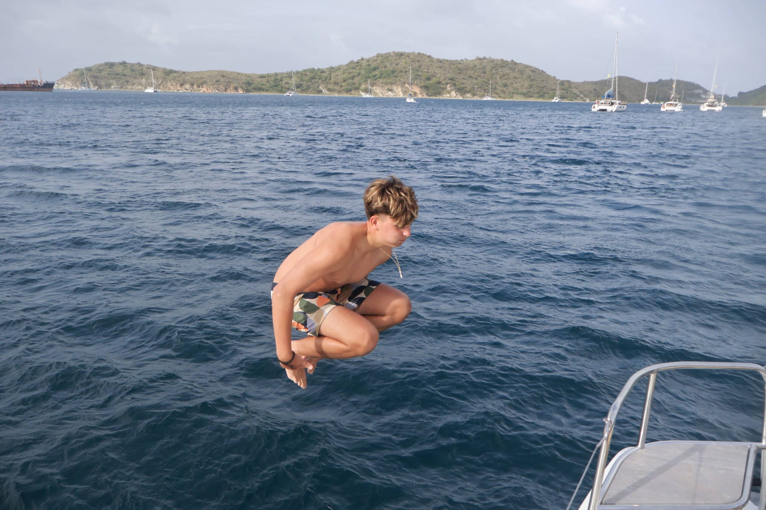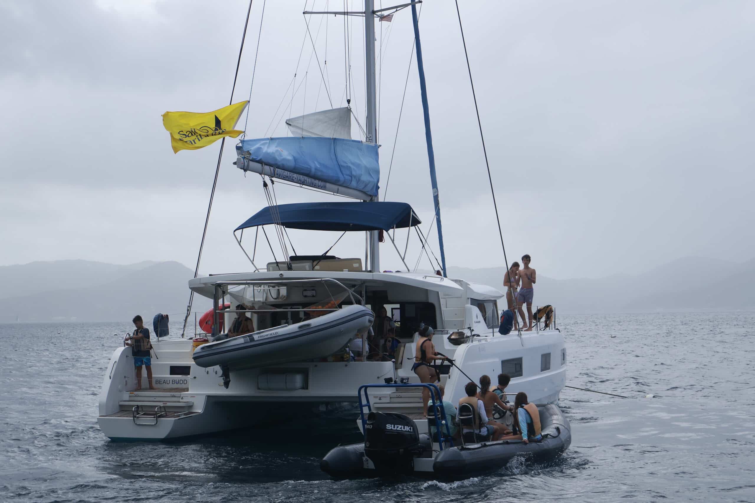 We kicked off bright and early at 6:45 AM, with Skipper Landon leading the charge and Navigator Ellie keeping us on track for the day. A tasty breakfast buffet gave everyone the energy needed for what turned out to be an exciting and action-packed day. The weather started out cloudy while sailing, and we even had one squall pass through, but the rest of the day was sunny with a UV index of 6—classic island weather!