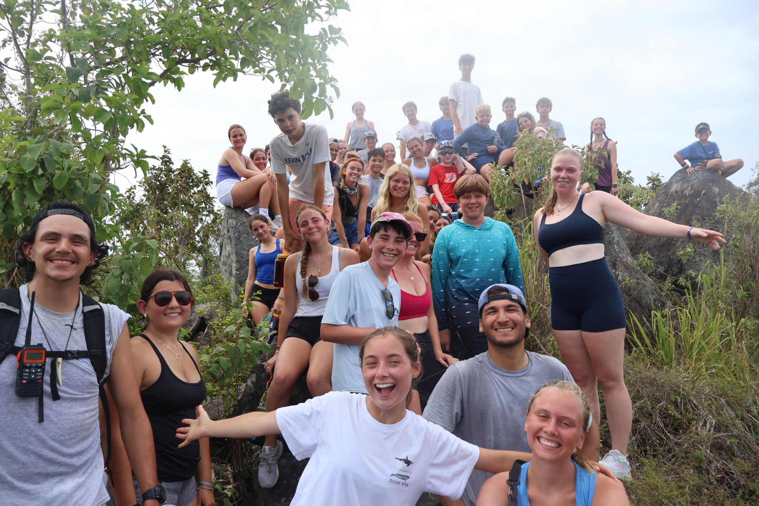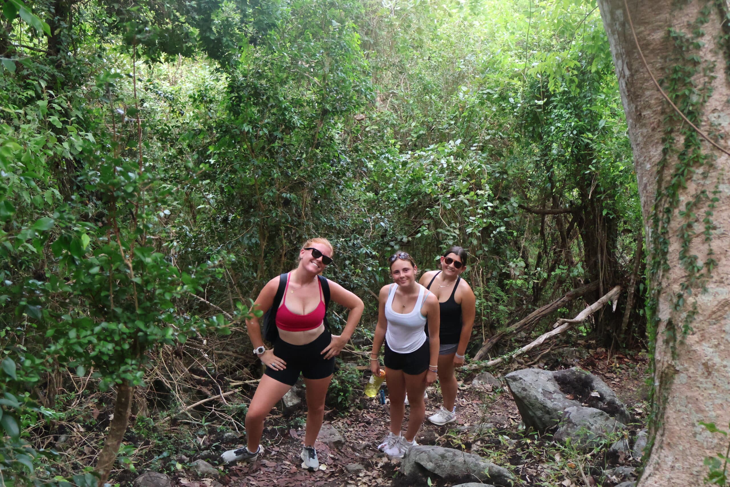 The hike took about 45 minutes uphill, and we were huffing and puffing. Surrounded by lush green terrain, we watched hermit crabs crawling around our feet. In a single-file line, we climbed the rocks, going up, up, up. Despite the steep climb, everyone kept a great attitude, and no one gave up.