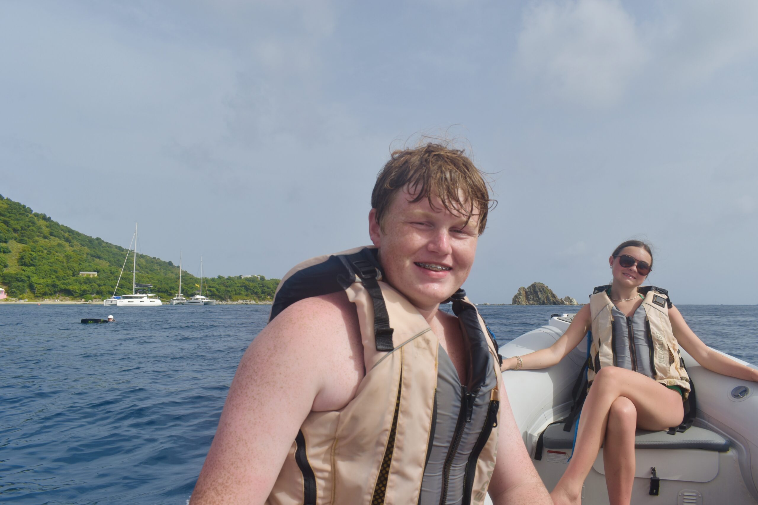 The next morning began with a breakfast of eggs and sausage, providing the perfect fuel for a busy day ahead. After enjoying our meal, we shuttled the divers to continue their dive training. The highlight of the day was their first open-water dive—a thrilling milestone that marked a significant step in their underwater adventures! Those who weren’t diving, anchored at Salt Island, where Captain Kate led a super fun and scenic hike!