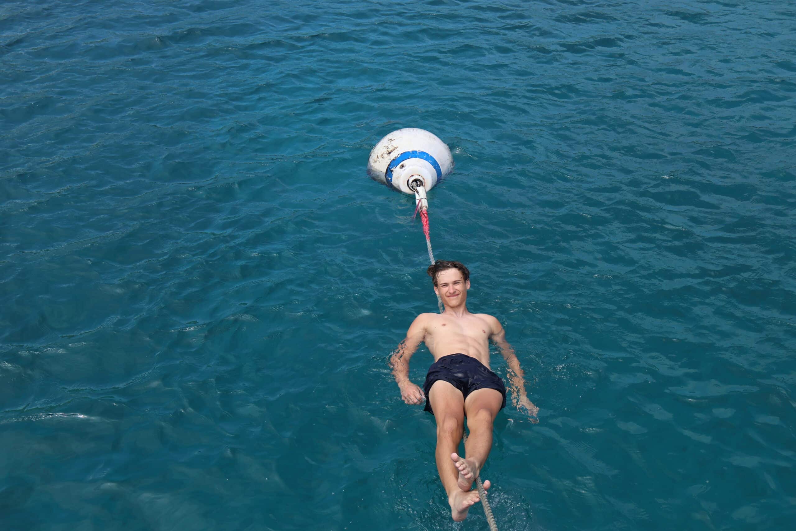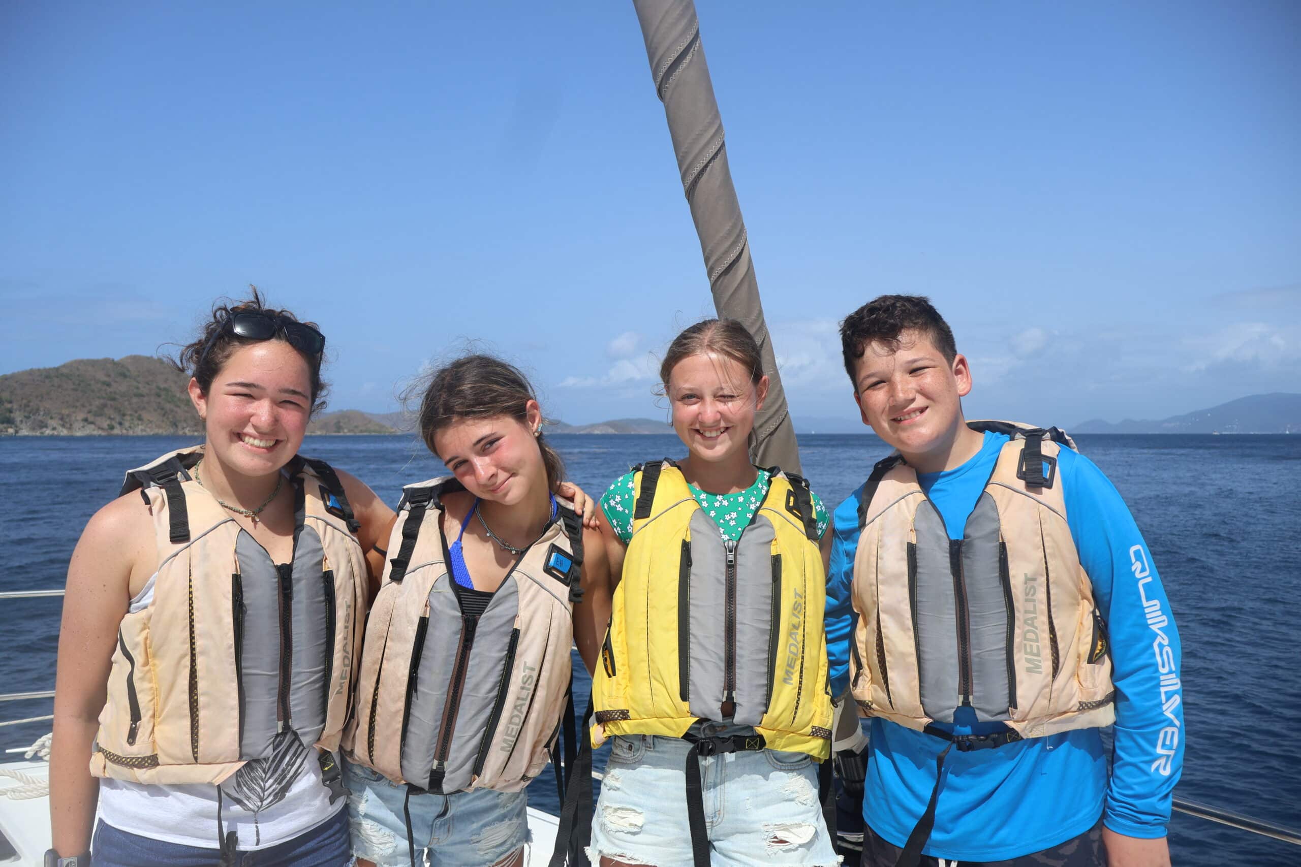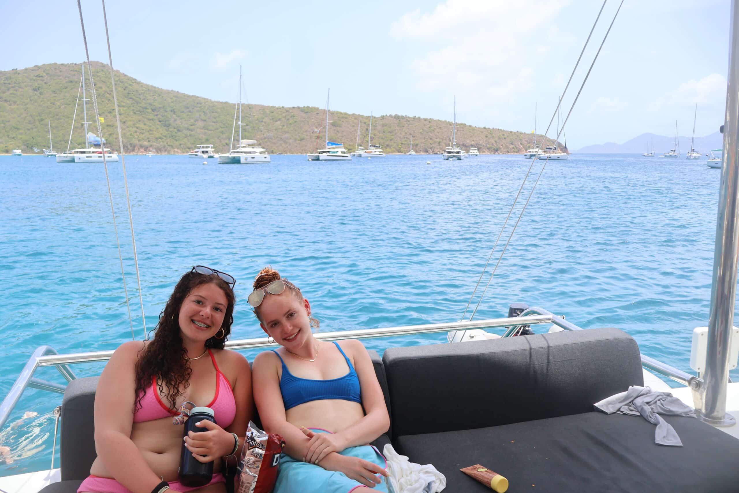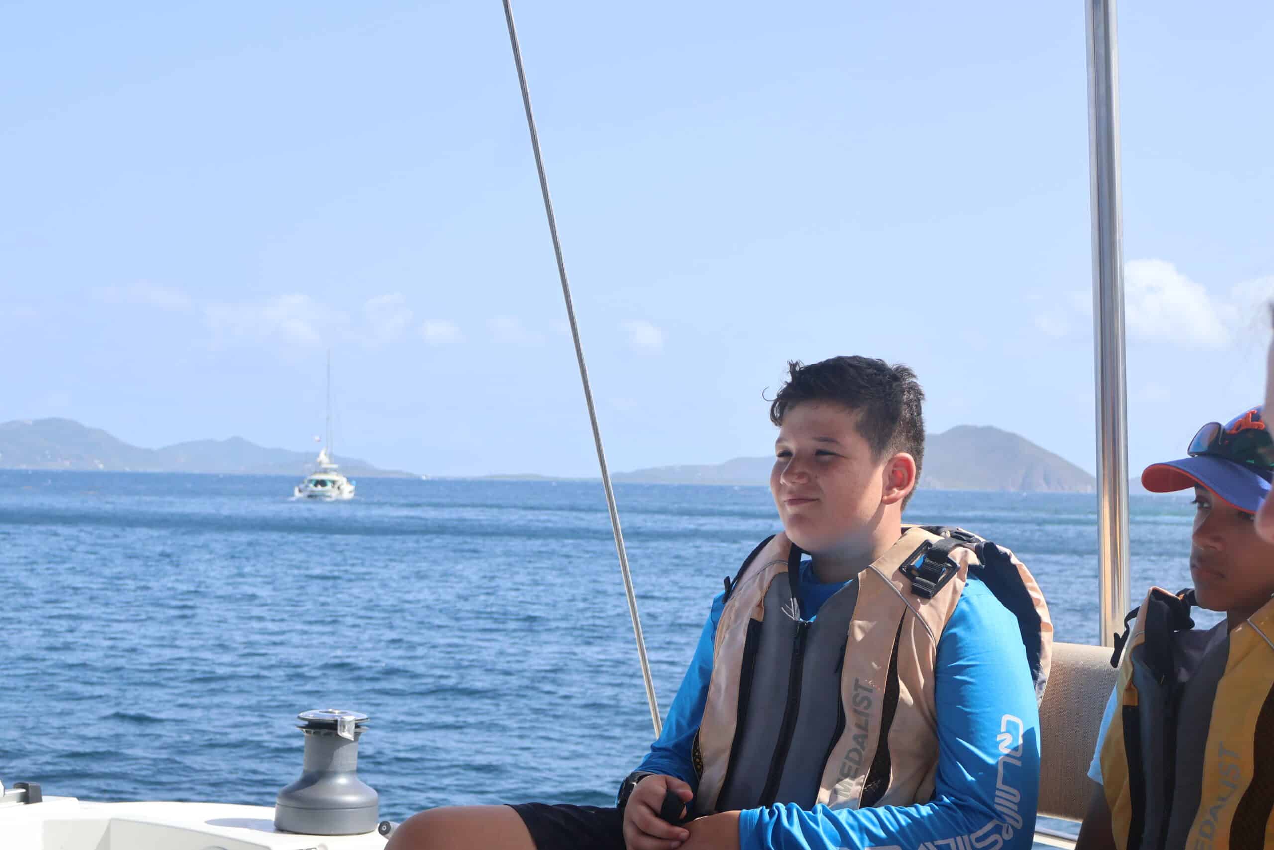 While the divers got ready for their morning dive, the rest of us welcomed a few students from Nohea to join us for a lovely downwind sail. After demooring, we were on our way. The sail raise was efficient and smooth, with positive vibes all around. Onye set the tone by curating a great playlist, and we sailed from Cooper Island to The Bight on Norman Island.