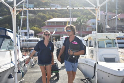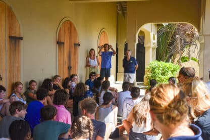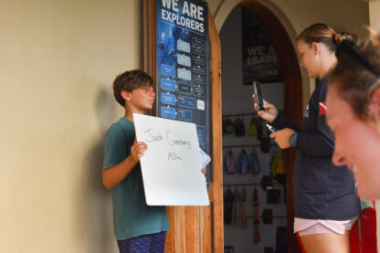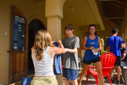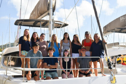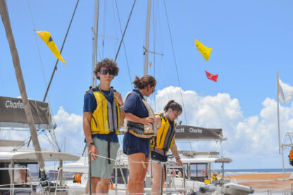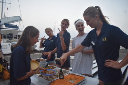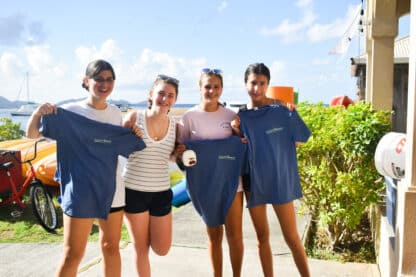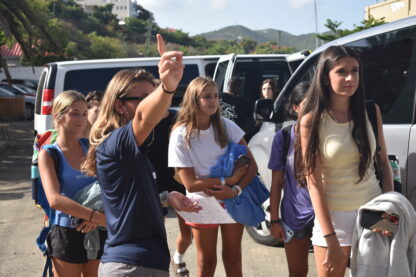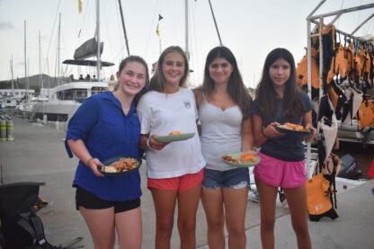 As the sun rose over the docks, the students all woke up to a breakfast buffet on their boats. Then, they started some rotations of sailing lessons on the boat, boat photos, and going to the dive shop to meet all of the divers and shop around. Before heading out for their first sail, we all met up in front of the office to have a “Mike Talk”. This is where Mike, our founder and director, welcomes all of them and goes over some of our policies and traditions. Finally, it was time to leave the docks! Today, there were a few sporadic squalls so they got to experience sailing in the rain.