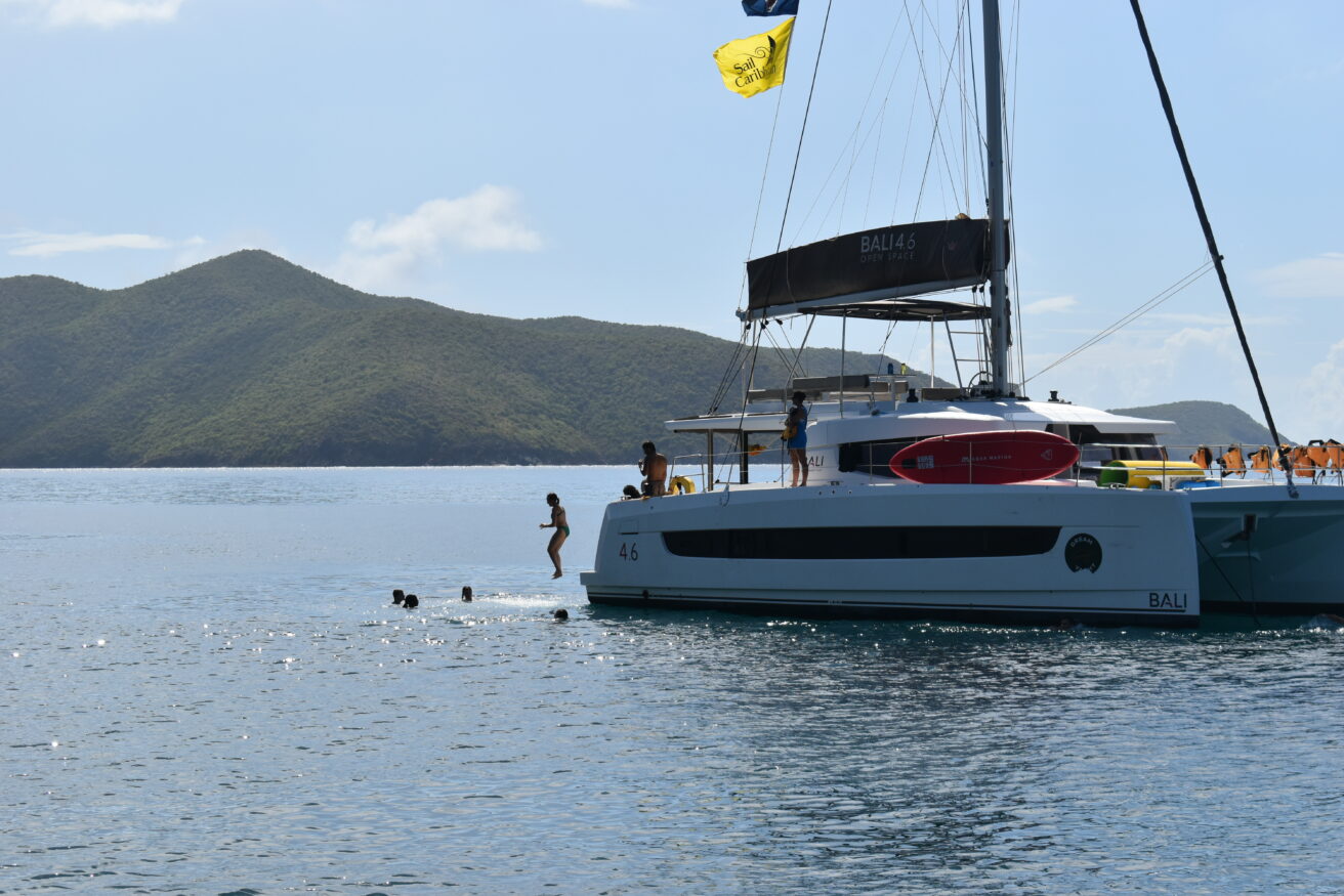 As the sun rose over the docks, the students all woke up to a breakfast buffet on their boats. Then, they started some rotations of sailing lessons on the boat, boat photos, and going to the dive shop to meet all of the divers and shop around. Before heading out for their first sail, we all met up in front of the office to have a “Mike Talk”. This is where Mike, our founder and director, welcomes all of them and goes over some of our policies and traditions. Finally, it was time to leave the docks! Today, there were a few sporadic squalls so they got to experience sailing in the rain.