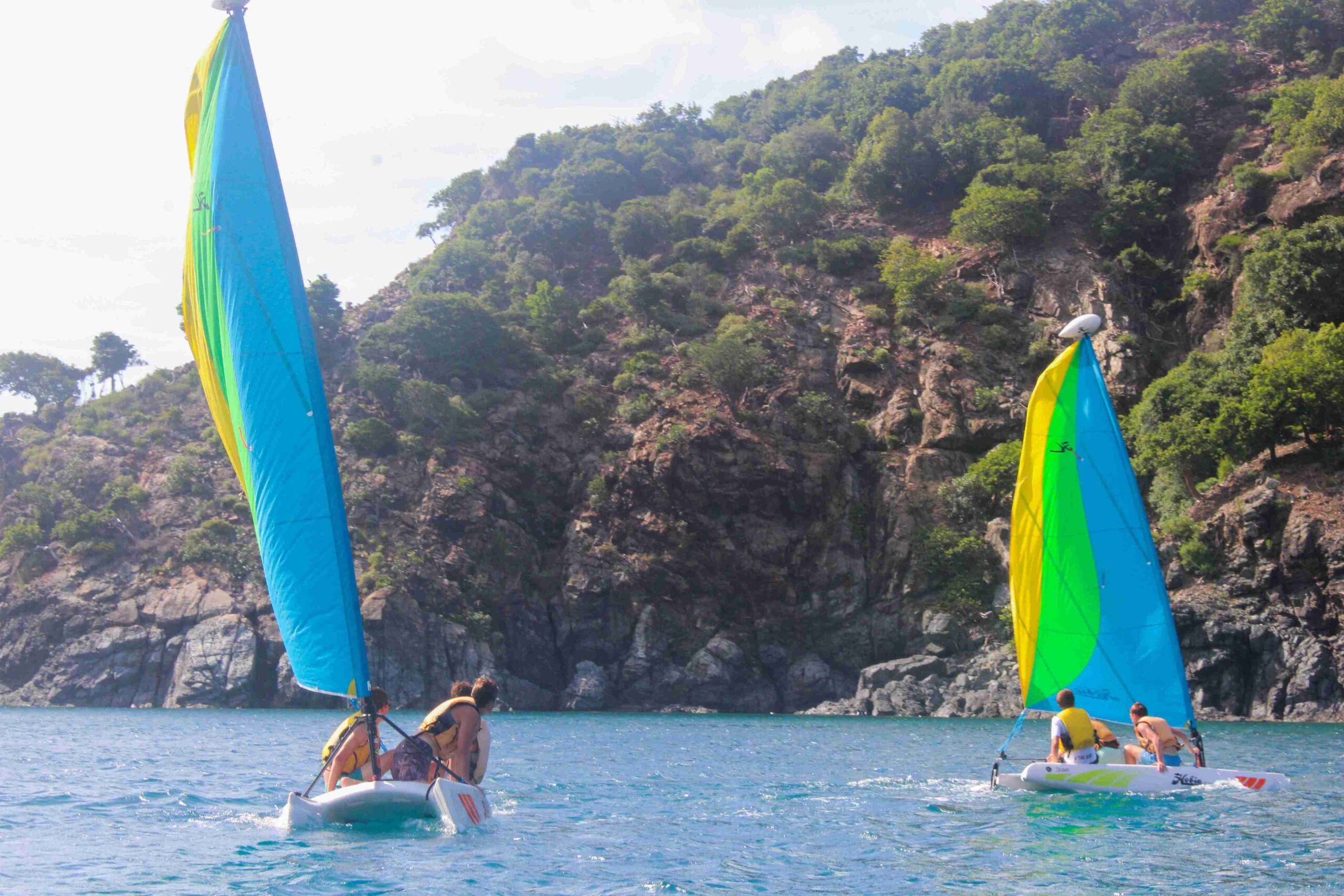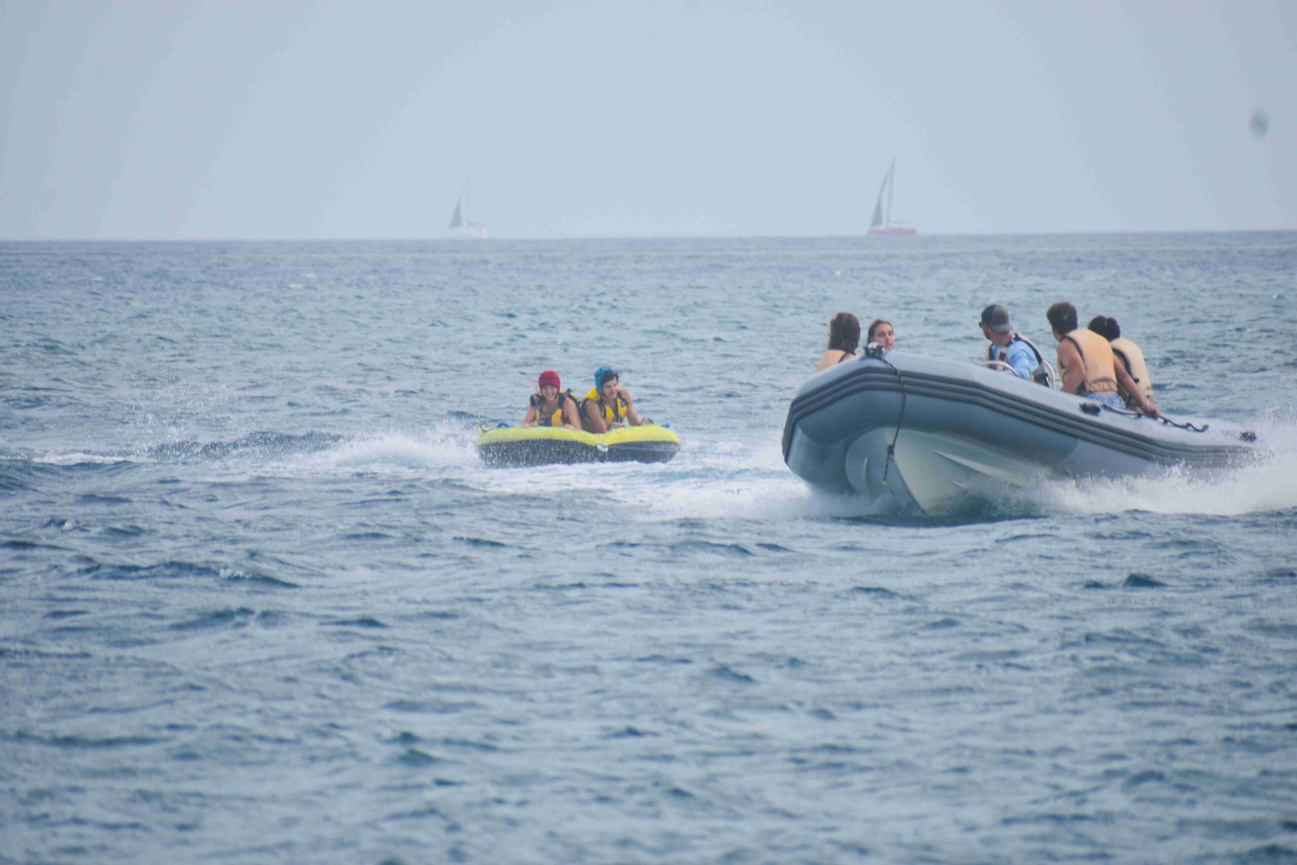 Life jackets are worn for all watersports, small boats and even on our 50’ yacht boats while under sail or power. Harnesses are worn during all night sails.